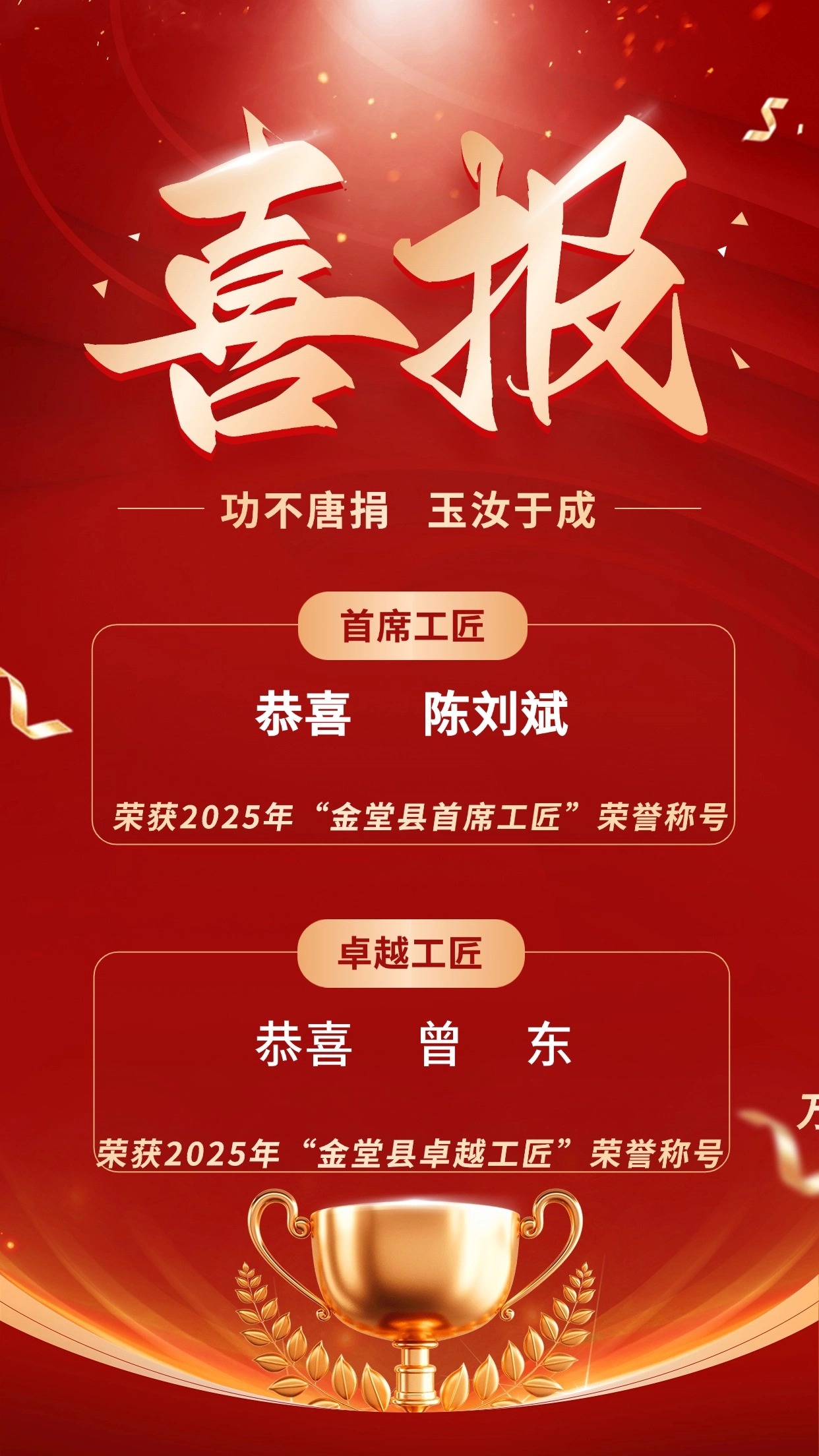 喜報(bào) | 我公司員工榮獲“2025年金堂縣首席工匠”和“卓越工匠