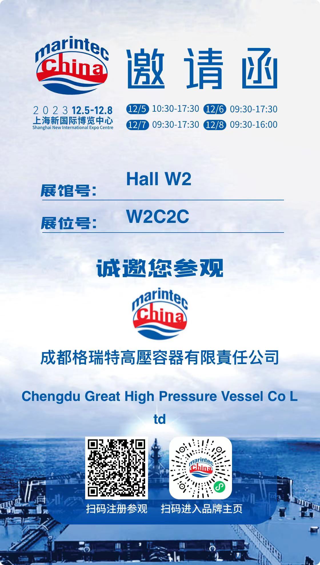 2023年中國國際海事會展將于12月5日至8日在上海新國際博覽中心舉辦。成都格瑞特高壓容器有限責(zé)任公司將共迎這一場久違的海事盛會,誠邀您的參與。